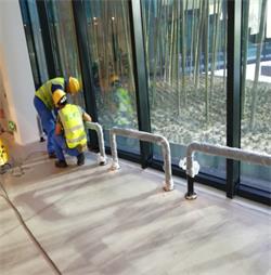 辦公區(qū)中庭玻璃處防撞柱現(xiàn)場(chǎng)安裝施工項(xiàng)目